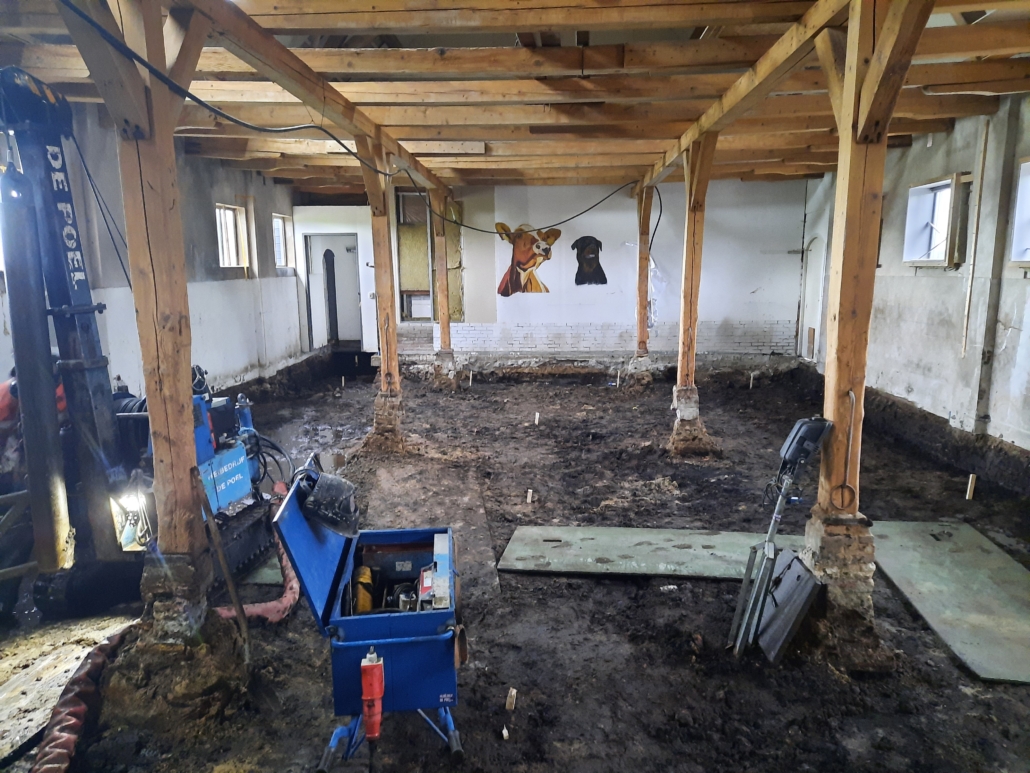 Een (woon)boerderij kan prachtig zijn, maar als het hele pand begint te verzakken, dan is dat een serieus probleem. Bij een prachtige boerderij in Hazerswoude was paalrot de oorzaak van de verzakking. We maakten samen met de opdrachtgever een herstelplan om de fundering te herstellen. Daarvoor moest eerst de betonvloer in het pand worden verwijderd, zodat we 32 stalen buispalen van dertien meter lengte en een diameter van 230 mm konden aanbrengen. In de buitenmuren boorden we maar liefst 87 gaten van 250 mm. zodat de nieuwe vloer in de buitenmuren verankerd kon worden. Deze wijze van herstellen wordt wel de tafel-methode genoemd: de buispalen dragen de vloer en door de nokken in de buitenmuren ook de volledige boerderij.