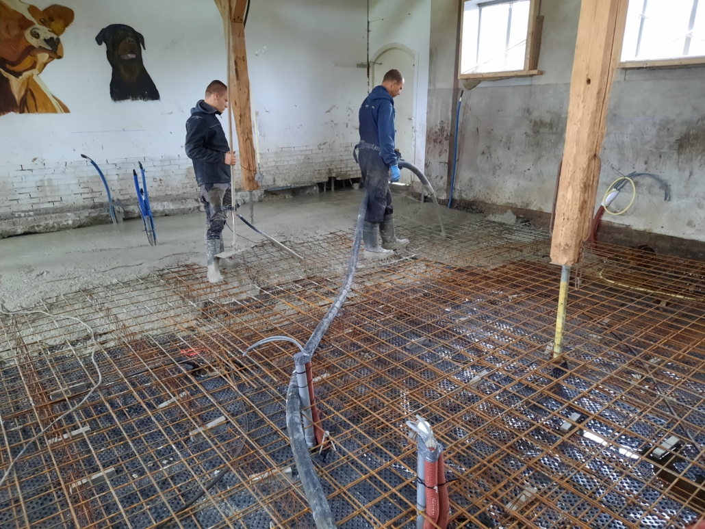 De wapeningsmatten van de vloer waren de basis waarop de installateur eerst de leidingen voor aardwarmte, riolering, elektra en domotica kon aanbrengen, waarna de nieuwe vloer werd gestort.