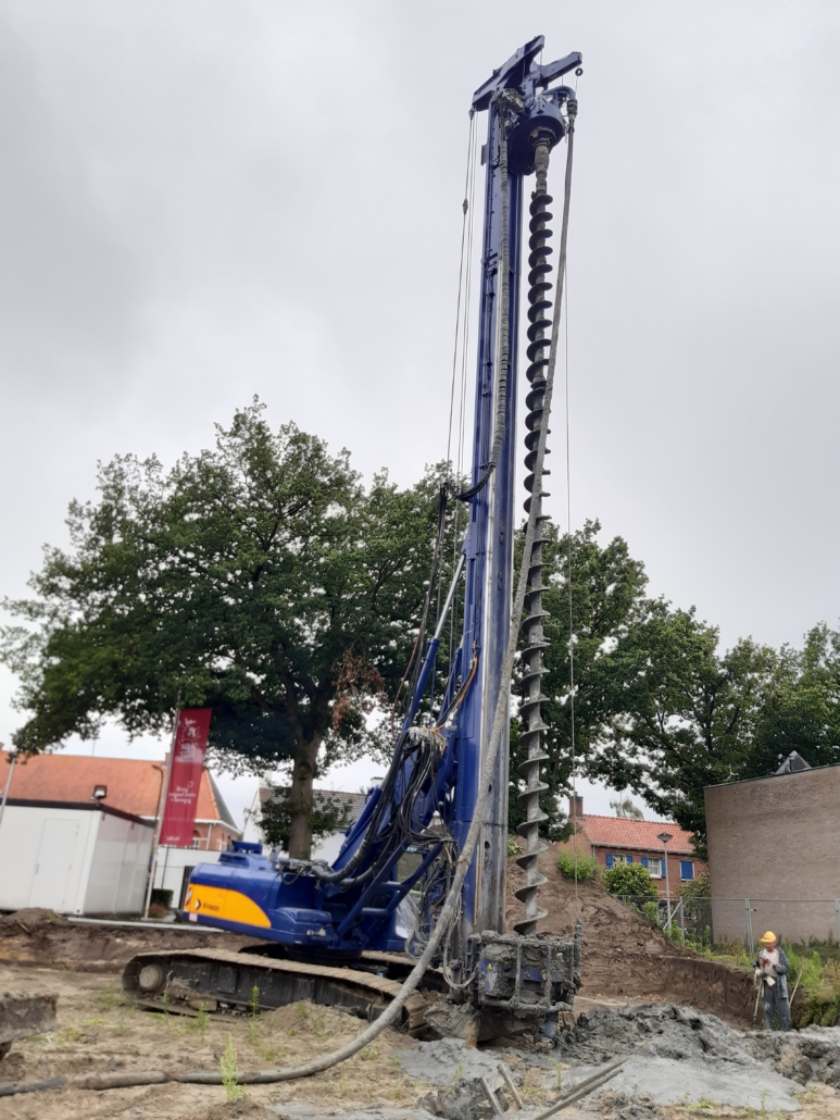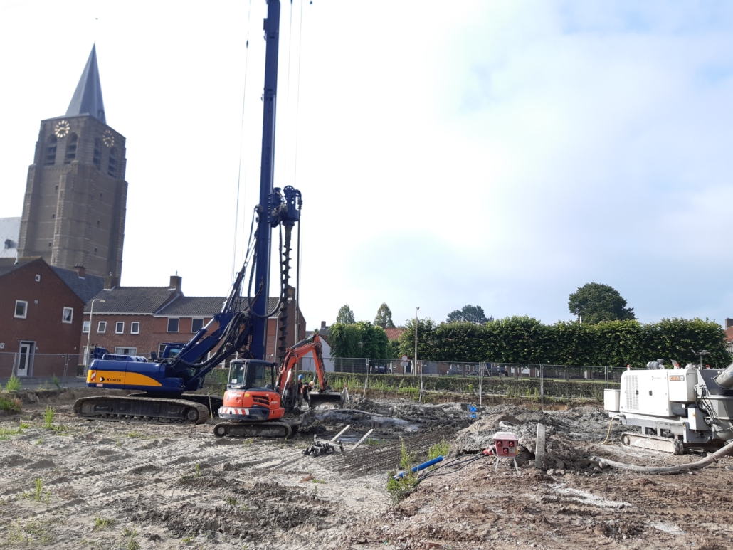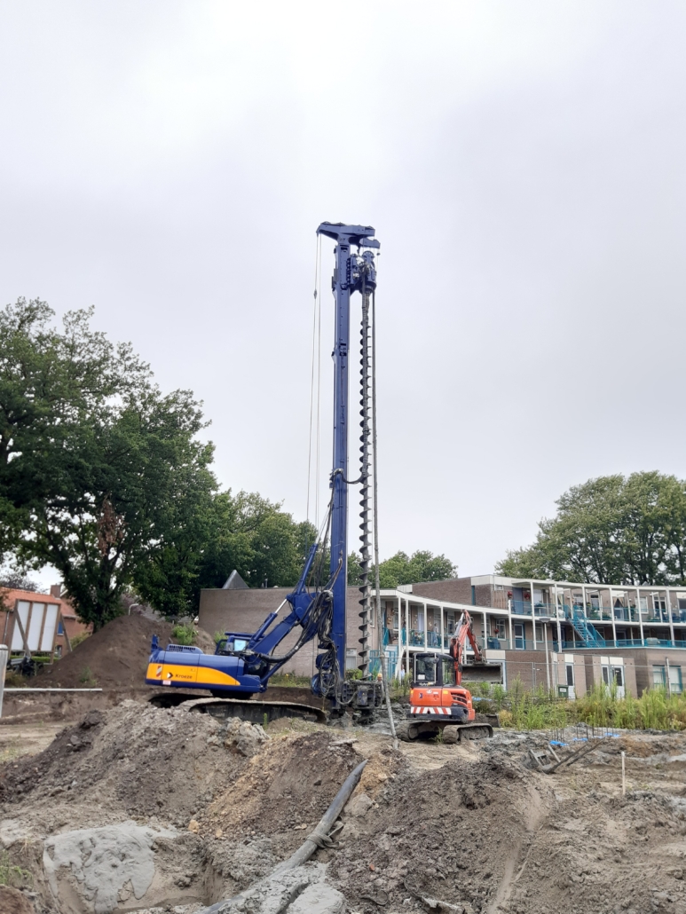 In het Brabantse Wouw was het deze zomer een beetje feest toen de bouwwerkzaamheden voor woonzorgcomplex Leonardeshof van start gingen. Een van de bewoners van het inmiddels gesloopte pand zette onze boorstelling in bedrijf. In korte tijd werden 154 mortelschroefpalen van 500 mm diameter en 16,50 meter lengte aangebracht. Een project waar de ‘flexibiliteit’ van onze boorstelling goed van pas kwam want op deze inbreidingslocatie in een kern moesten we ook rekening houden met ondergrondse obstakels die resteren van het gesloopte pand.